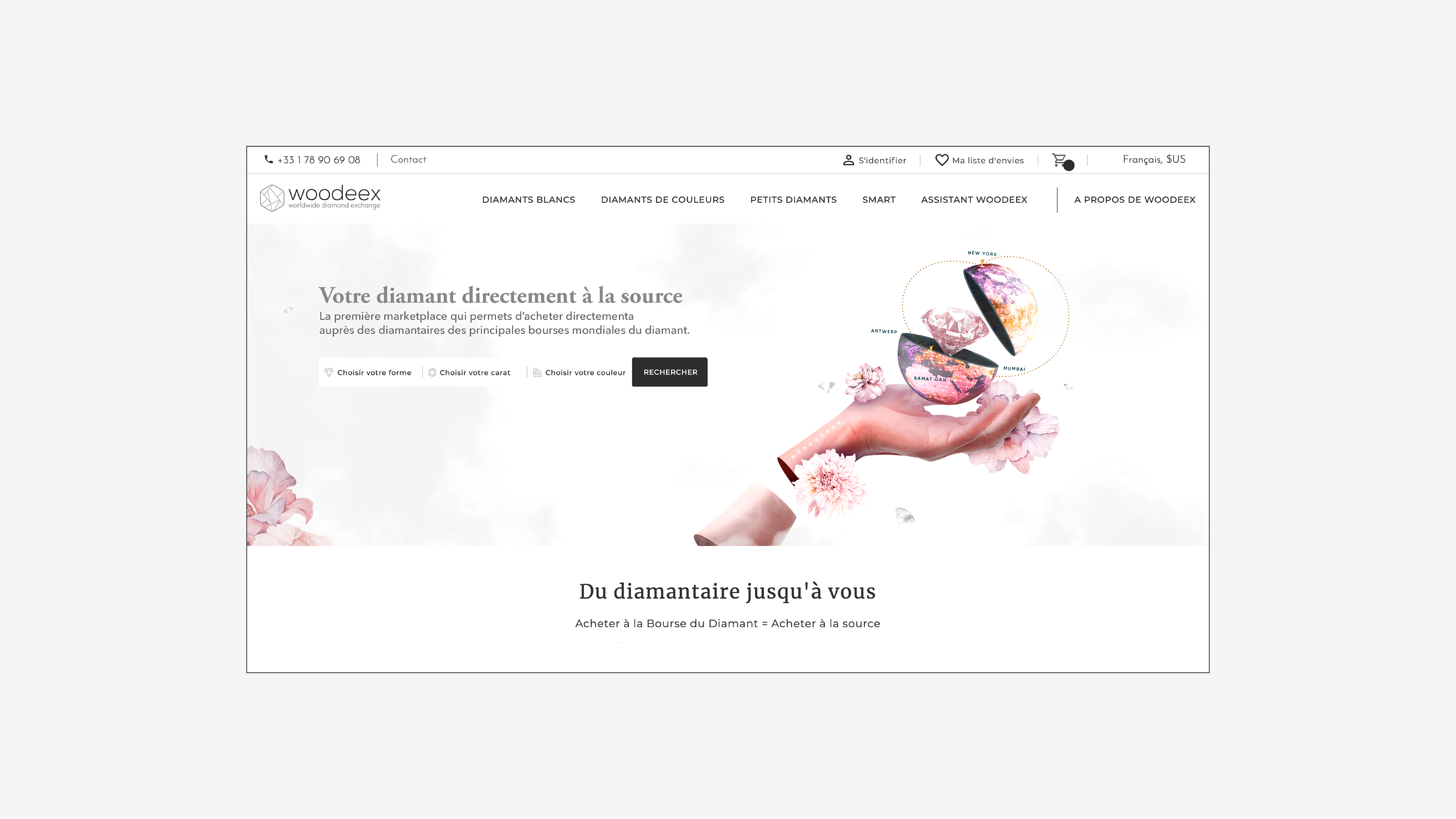 Visuel pour la home page du diamantaire Woodeex. L'objectif était de mettre en avant le fait que le diamantaire aille chercher au 4 coins du monde les diamants pour les apporter directement au client. J'ai voulu créer un univers onirique autour du diamant.